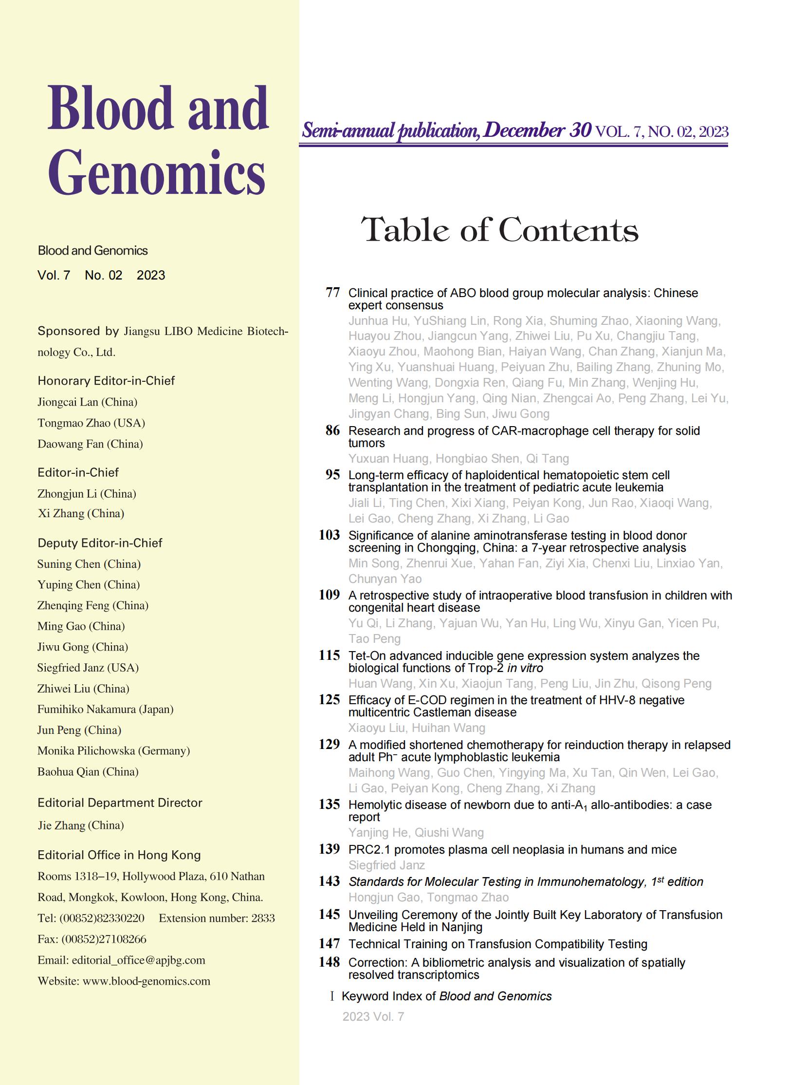 2023年12月30日,《Blood and Genomics》2023年二期正式發(fā)表。本期包括Review、Original Article、Brief Report、Case Report、Letter to the Editor以及Books and News等類型文章,對ABO血型分子分析、CAR-M細(xì)胞治療實(shí)體瘤、單倍體造血干細(xì)胞移植治療兒童急性白血病、先天性心臟病患兒術(shù)中輸血等輸血以及血液領(lǐng)域的熱點(diǎn)話題進(jìn)行研究與探討。